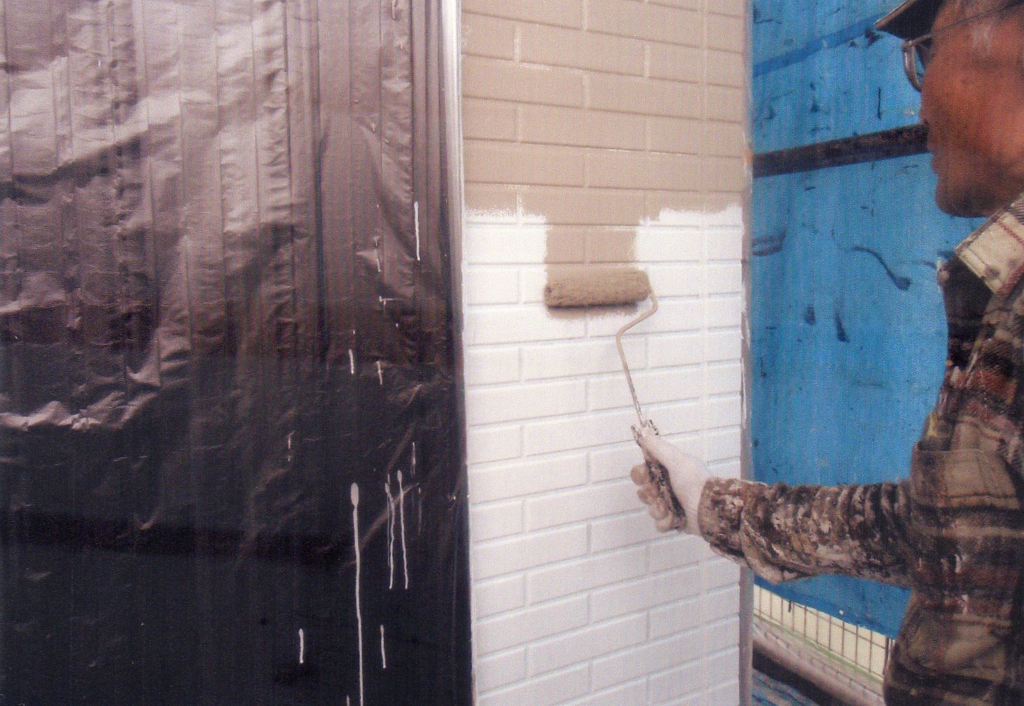 2階 モルタル部分の外壁塗装4回塗り 下塗り、エポエムシーラー 1回 中塗り、微弾性フィーラー 1回パターン付け 上塗り、DANシリコンセラ 2回