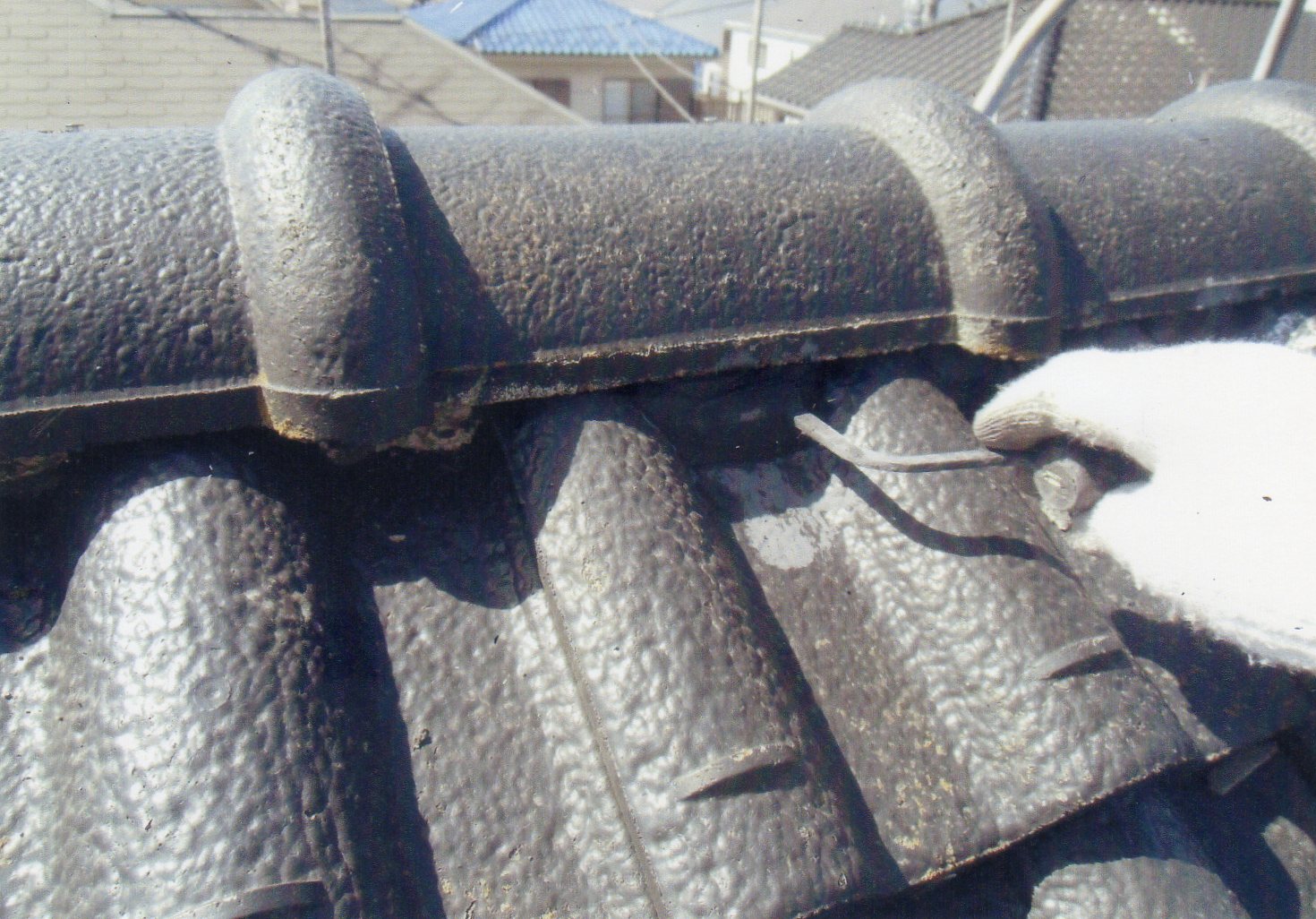 屋根瓦塗装3回塗り 下塗り、ミラクシーラー1回 強溶剤2液 上塗り、ヤネフレッシュ2回 シリコン弱熔材2液
