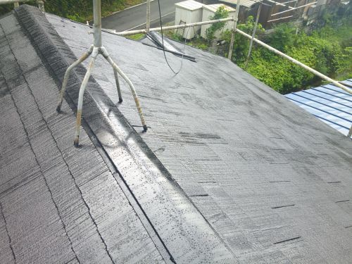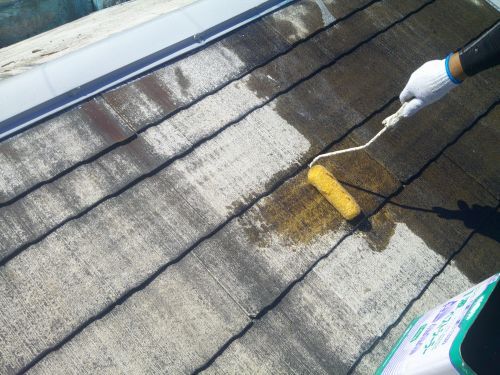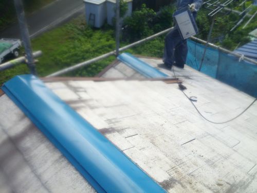 屋根修理塗装ときがわ町 工事費総額 200,000円 屋根は初めてですコケも多く破損有り 足場組み後洗浄 下塗り 1液ベストシーラー1回 上塗り、ファインシリコンベスト2回 屋根コロニアル破損部分の直し 屋根ムネトタン取り換え 下地板貫き取り換え 下屋根トタン錆止め後に塗装 屋根修理塗装終了 施工コスモスペイント
