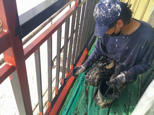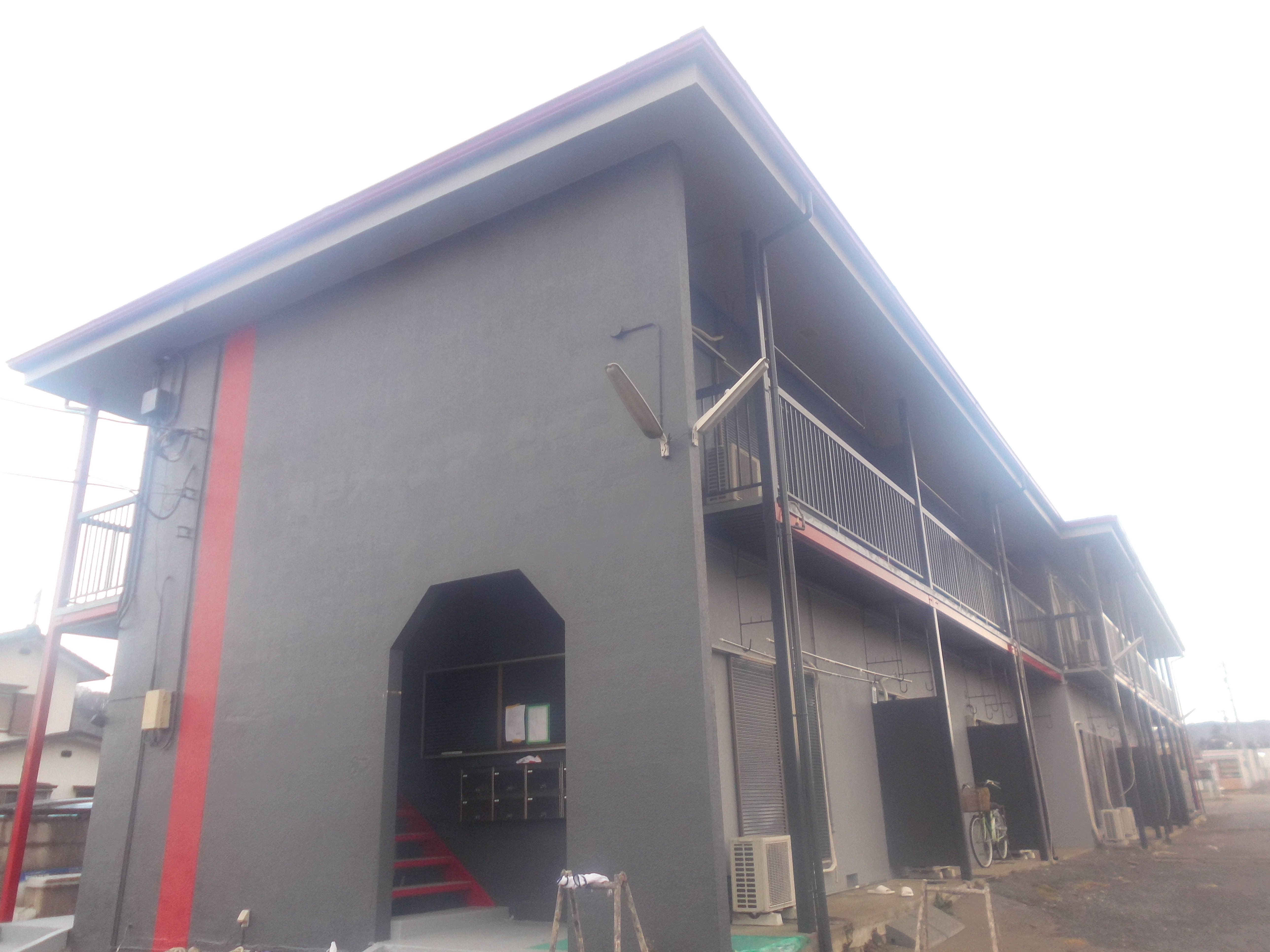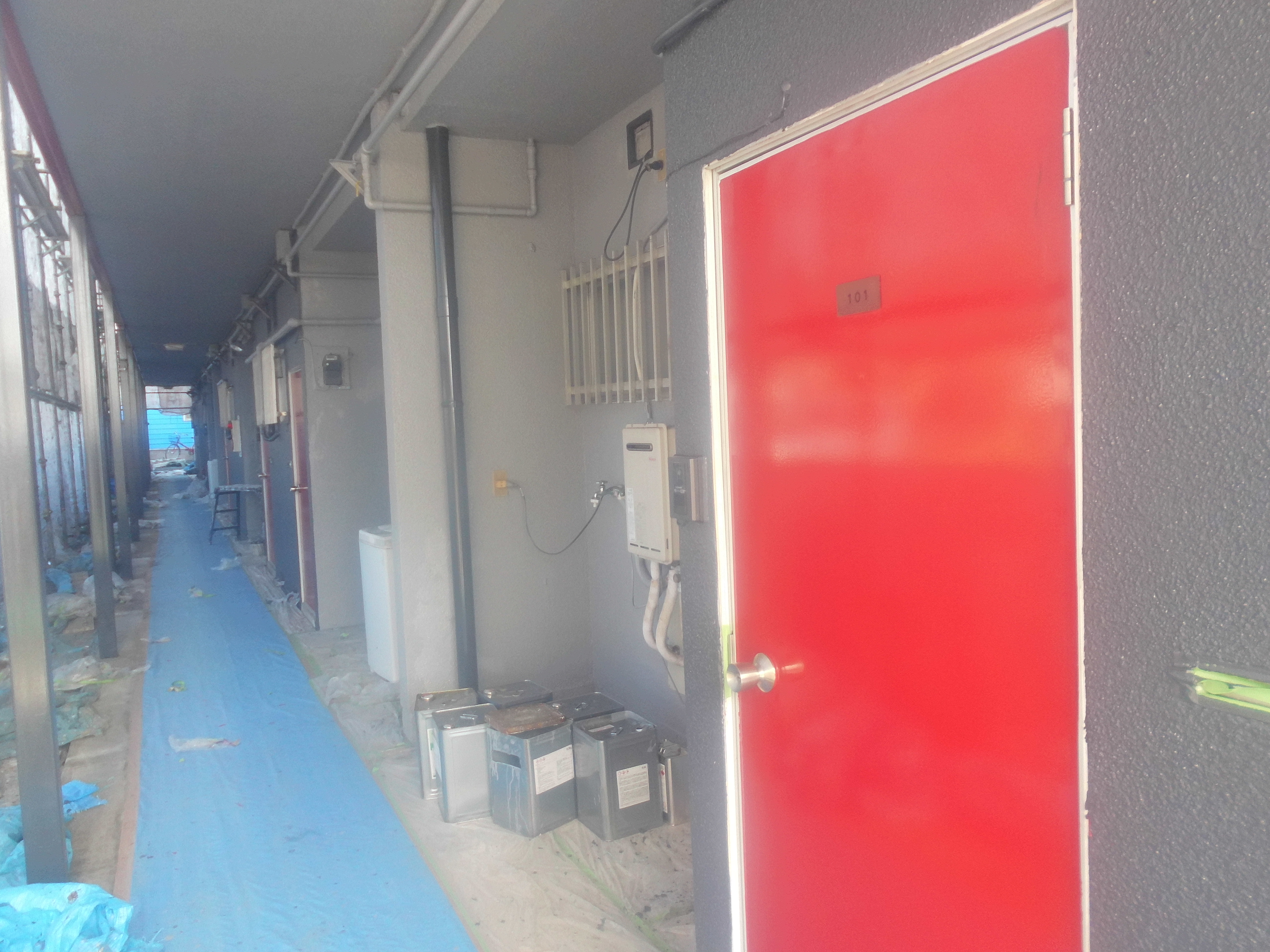 12世帯の2階建物築45年 工事費総額 2、050、000円 外壁塗装3回塗り 下塗り 水性カチオンシーラー1回 上塗り セラミクリーン2回 外壁モルタル補修施工 屋根トタン塗装 シーリング処理 洗浄とケレン磨き後の塗装 付帯塗装 雨樋 階段 ベランダ手すり物干し 仕切り板 通路手すり フード 玄関ドア パイプ等 鉄柱 ウッドデッキ 雨戸等 上記鉄部多く錆止めと仕上げ塗装の施工 足場も当方で組んでの施工 1階。2階通路床塗装 強溶剤2液下塗り1回 AUコート強溶剤2液2回 施工コスモスペイント